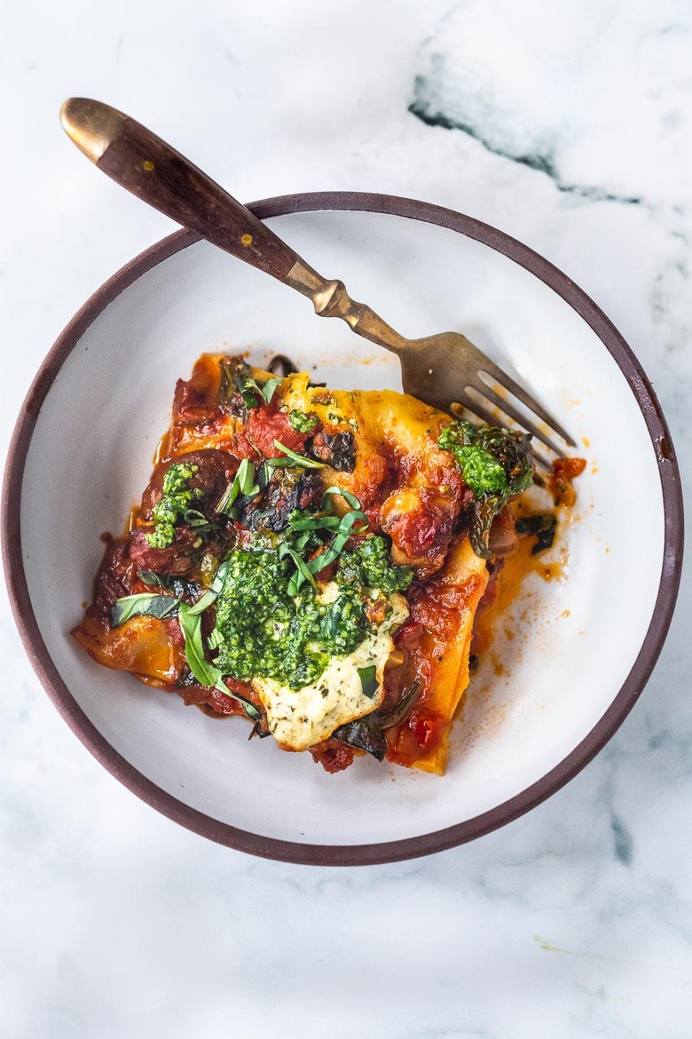 Step 6: Serve! Not only will the arugula pesto add bright flavor here, but it will also elevate the vegan lasagna’s appearance. Add the last of the basil ribbons.