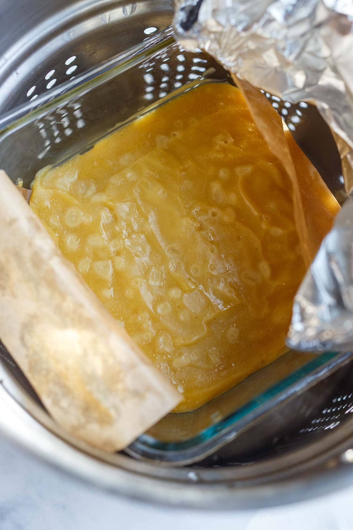 - Cover with the parchment and place a piece of foil over the top , sealing it, and place it in the steamer basket.