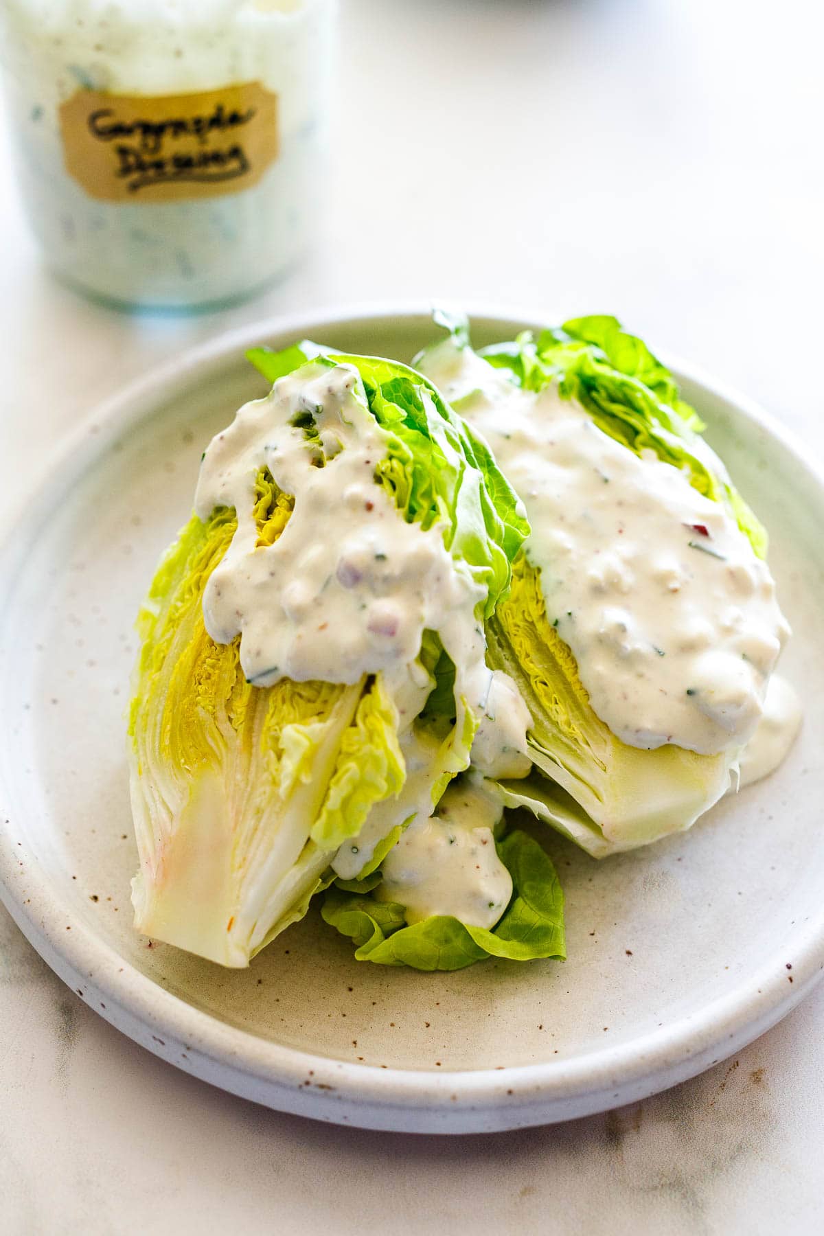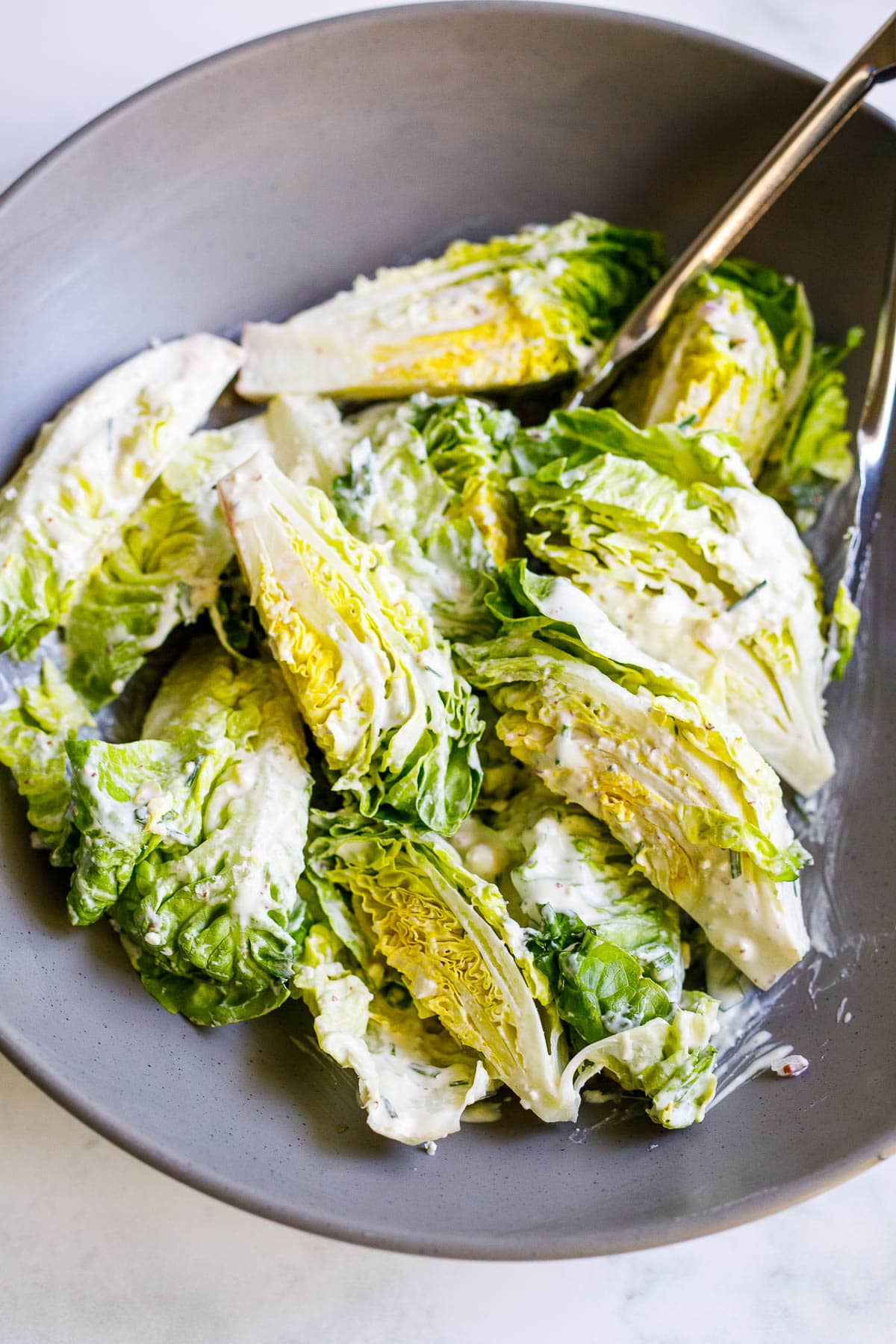 - Lettuce– Here, we are using Little gem lettuces instead of the traditional iceberg wedges, but romaine lettuce, romaine hearts, a head of iceberg lettuce or any other crisp, sturdy lettuce that will hold up to the dressing will work!