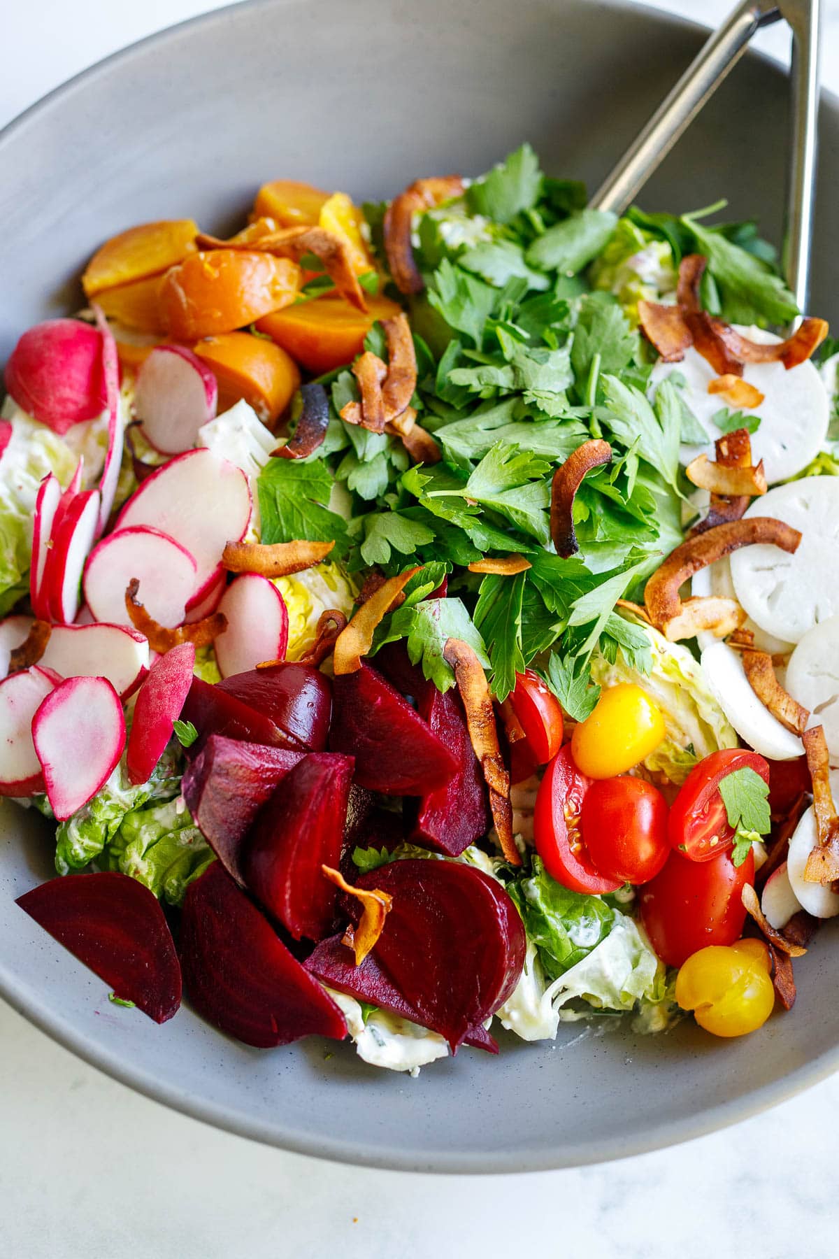 Cool and crisp Wedge Salad made with little gem lettuce, beets, tomatoes, radishes, herbs and coconut bacon, topped with Creamy Gorgonzola dressing.